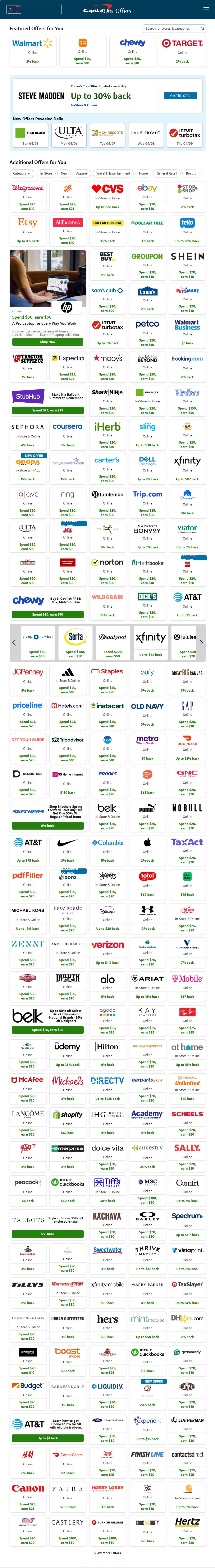 If you have a CapitalOne credit card, their offers section (shown only after you log in) has some VERY generous cash back offers (paid as a statement credit) when you use their links for particular purchases ONLINE. Every account has different offers, but here are some from MrConsumer's account. Home Depot - spend $25, earn $25; Walgreens - spend $20, earn $10; Sam's Club - spend $20, earn $20; Expedia - spend $25, earn $25; Lululemon - spend $20, earn $20; Ace Hardware - spend $20, earn $20; Office Depot/Staples - spend $20, earn $20; GNC - spend $20, earn $20; Zenni - spend $20, earn $20; MattressFirm - spend $50, earn $50, and many more. It is not clear if you use one offer that all the other offers will remain as generous. Follow all rules to assure your rebate. This is NOT the same as CapitalOneShopping.com.